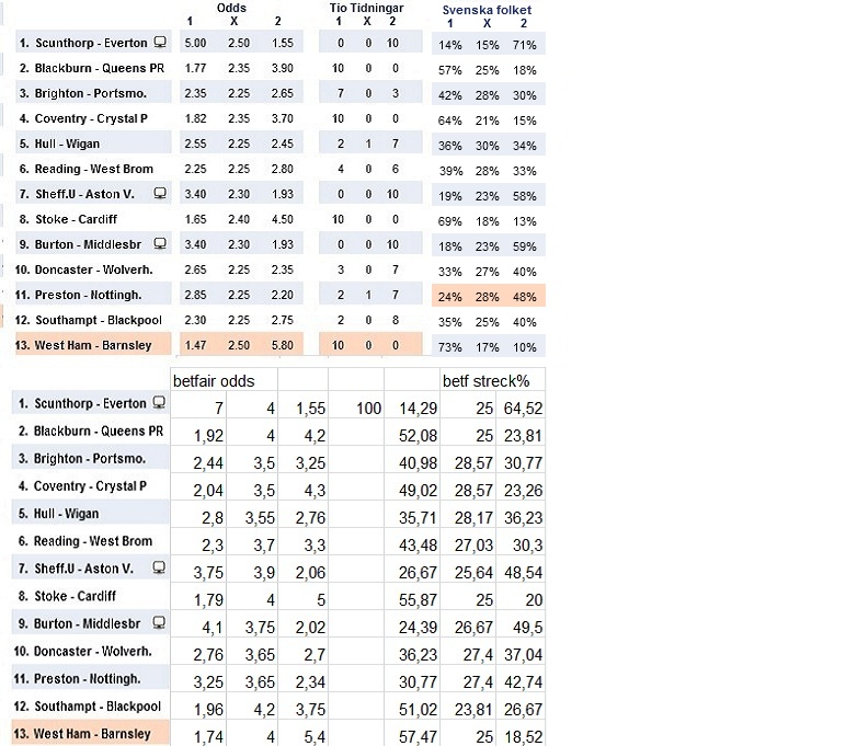 Uppdaterade odds och streck från betfair kl 13, återkommer med svenska folket om tid finns.