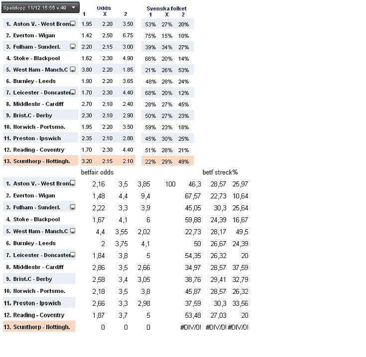betfair odds betf streck% 2,56 3,3 3,2 100 39,06 30,3 31,25 1,51 4,4 8,8 66,23 22,73 11,36 2,18 3,35 4 45,87 29,85 25 1,61 4,5 6,2 62,11 22,22 16,13 4,3 3,5 2,02 23,26 28,57 49,5 2 3,75 4,1 50 26,67 24,39 1,78 4 5,1 56,18 25 19,61 2,76 3,55 2,74 36,23 28,17 36,5 2,58 3,4 3,05 38,76 29,41 32,79 2,18 3,5 3,8 45,87 28,57 26,32 2,44 3,4 3,25 40,98 29,41 30,77 1,82 3,95 4.90 54,95 25,32 #VÄRDE! 0 0 0 #DIV/0! #DIV/0! #DIV/0!