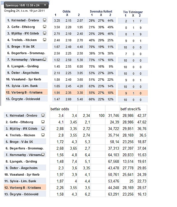 Stryktipset 18/6 med Svenska Folkets samt Betfairs streckprocent