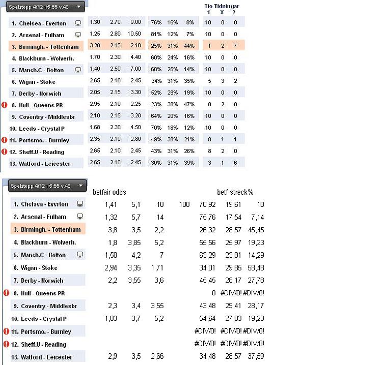 Stryktipset med Betfairs odds och omräknat till värdering%