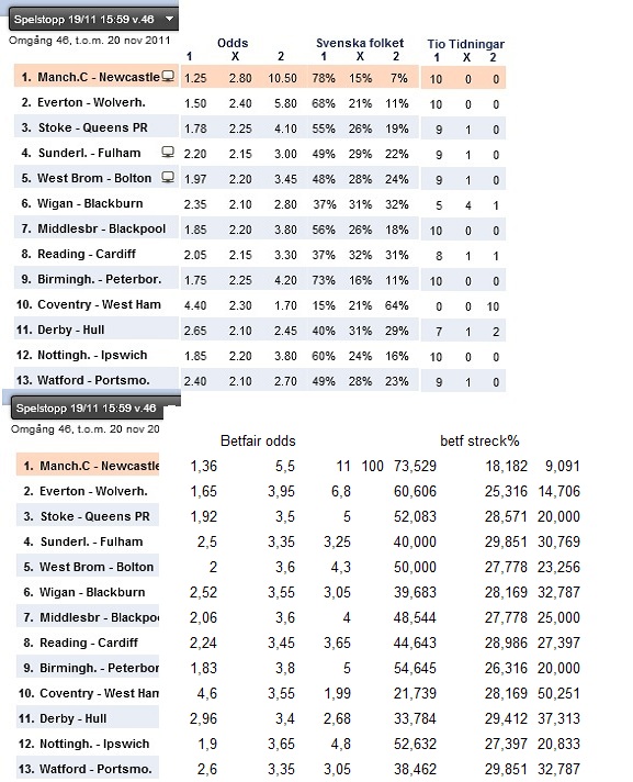 Stryktipset med Betfairs odds och streckprocent